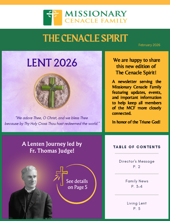 Founded by Fr. Thomas Judge in 1909, the Missionary Cenacle Family exists to glorify the Triune God by participating in the mission of Jesus as an apostolic family which is missionary in the providence of daily life. We are a family of four branches: